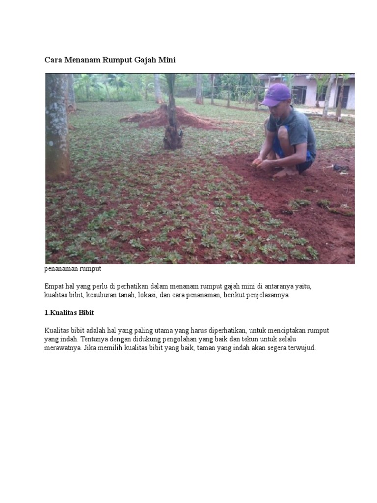 Berikut ini cara sederhana untuk menanam rumput gajah mini : Pasalnya rumput gajah tidak terlalu membutuhkan perawatan yang ekstra, bahkan rumput gajah dapat tetap tumbuh tanpa dilakukan pemupukan secara rutin jika ditanam. Cara penanaman rumput gajah mini pada dasarnya sama dengan rumput jenis lain. Rumput jepang menjadi salah satu jenis tanaman hias yang biasa di tanam di taman atau halaman rumah. Cara yang pertama memungkinkan perbanyakan dengan lebih cepat.